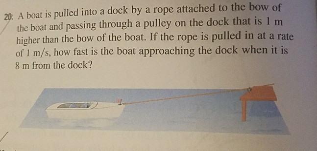 If the rope is pulled in at a rate of 1 m s how fast is the boat approaching the dock when it is 8 meters from the dock.